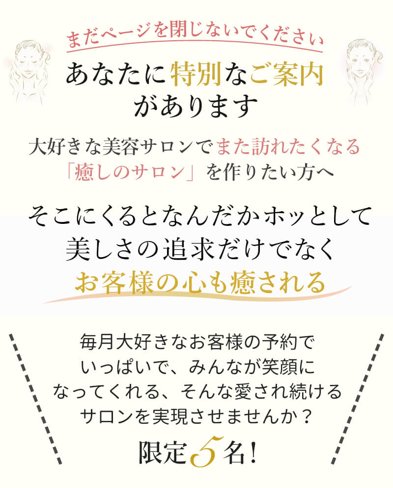 このページをご覧の方限定で、『また訪れたくなる 「癒しのサロン」 づくり』の個別オンライン説明会を開催します。